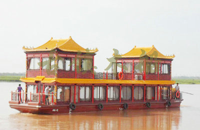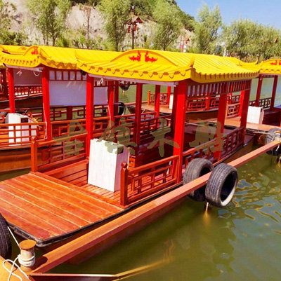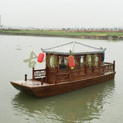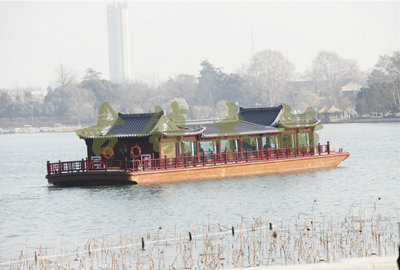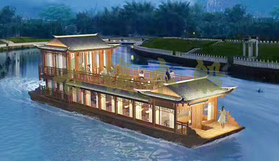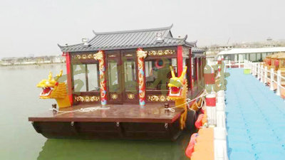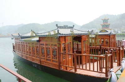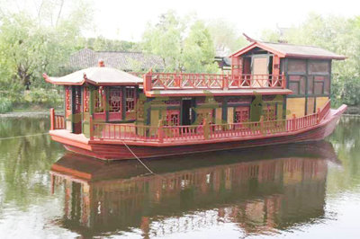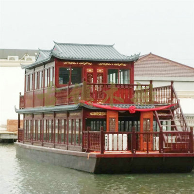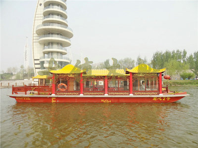 畫舫船就是裝飾古典華麗的游船,是"中國風(fēng)"的仿古游船,結(jié)合古典園林建筑,體現(xiàn)了中華文明的古典藝術(shù).畫舫船豪華而又古典,船上的建筑按照中國古代建筑里的亭臺樓閣,建筑工藝之復(fù)雜,要求之嚴格,仿古畫舫游船的特點飛檐翹角、玲瓏精致的四角亭子逐漸成形,赫然立于船頭,美人靠、盤龍柱子、彩畫……龍柱上的浮雕盤龍和祥云一層扣著一層,層層錯落有致,雕刻精細到盤龍身上的每一個鱗片都細細可數(shù),古代皇家標(biāo)志性元素,在畫舫船上體現(xiàn)的淋漓盡致。除了雕刻、花窗,整條船還有一個看點,那就是弧線優(yōu)美、高高翹起的船尾。游船并不大,長約10米、寬3米,但是整體看起來堪稱一件藝術(shù)品。船尾的雕花欄桿與船艙、船頭的雕刻遙相呼應(yīng),船身四周貼著浮雕祥云,給整條船增添了富貴、華麗的氣質(zhì)。